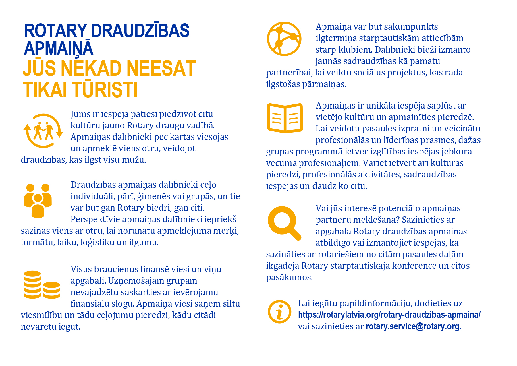 Apmaiņa ir abpusēja! Katrs rotarietis, kas piesakās braucienā ir gatavs uzņemt pretvizītē atbraukušo grupu – palīdz sagatavot viesu programmu, sagaida un pavada lidostā, uzņem savā ģimenē, piedāvā naktsmājas, ēdienu, nodrošina transporta pakalpojumus, utt., utt.